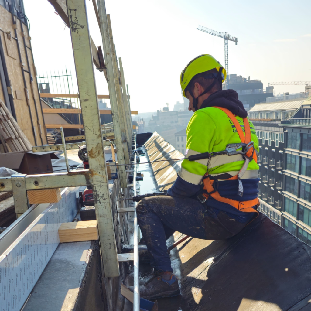 Gli operatori sono dotati di imbracature e dispositivi di aggancio che permettono loro di collegarsi in sicurezza alla linea vita. Questi dispositivi sono progettati per ridurre al minimo il rischio di caduta e disperdere l’energia in caso di incidente.